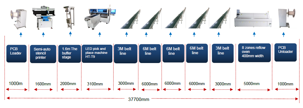 SMT production line mainly include: printer machine(The solder paste is missed printed on the PCB pad through the steel mesh of the printer), pick and place machine(Mount the drive and other components at the designated position on the PCB), reflow oven(Melt the solder paste to make it adhere to the mounting element), conveyor(It is used for the connection between SMT production lines, buffer, inspection, test of PCB, or manual plug-in of electronic components)